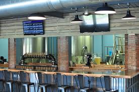 A polished copper top bar faces the gray subway-tiled draught board, liquor-stacked wood shelving and large on tap menu. The epoxy-floored, gray-walled, high ceilinged taproom features skinny community tables, stooled wood tables, several orange crossbeams and windowed brew tanks. A wood benched patio section adds outside seating.